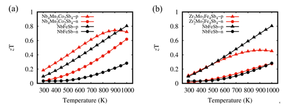 图2. Nb4Mn2Co2Sb4(a中红线),Zr2Mo2Fe4Sb4(b中红线)和NbFeSb(黑线)的zT值。三角形和圆形分别表示p型和n型的热电性能。