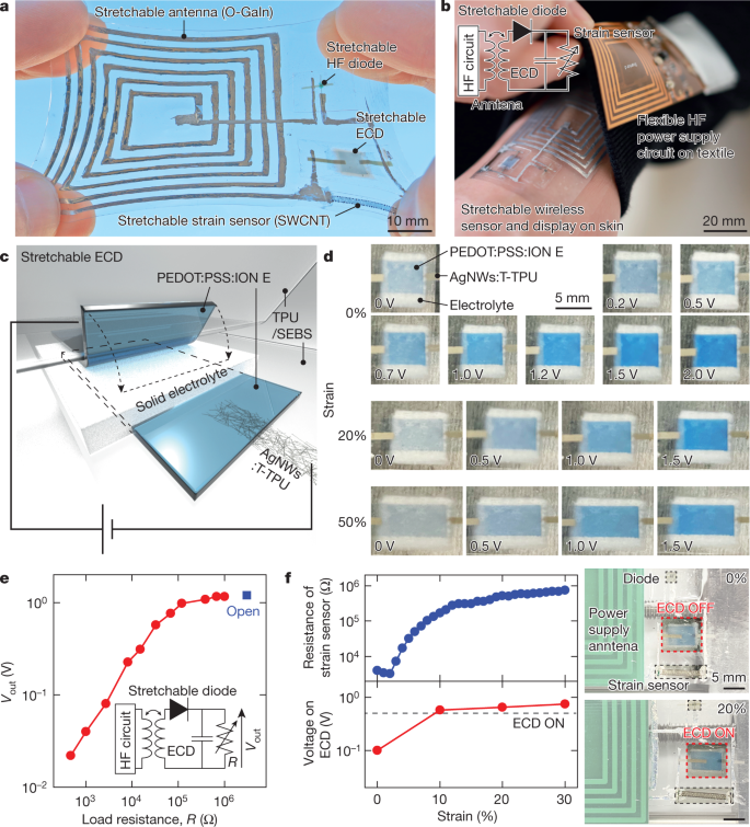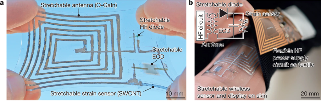 研究发现,成标签可以通过使用可伸缩天线接收能量并将其整流为直流电压来无线操作。当标签由柔性的电源电路无线供电时,ECD像素可以将来自应变传感器的信号可视化。未来可以通过降低可拉伸晶体管的工作电压以及提高二极管和天线的电压输出来实现其他应用,例如无线可拉伸生物信号放大器。