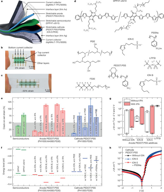 3.阴极层(130 nm): 需要高于 50% 的开裂应变和足够小的WF以与DPP4T-oSi10(约4.8 eV)形成肖特基接触。采用PEDOT:PSS:IONE和高分子量 PSSNa (Mw = 1 MDa)的混合物制成,表面经过聚乙烯亚胺乙氧基化(PEIE)改性。