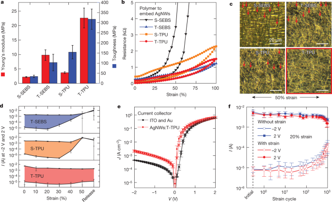 图 2:基于 AgNW 可拉伸集流体的二极管的性能表征。