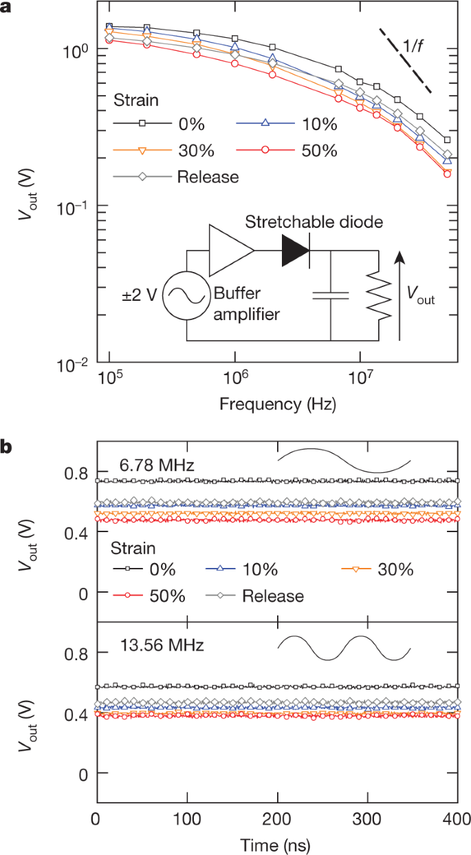 通过使用半波整流器电路(图 3a),研究团队证实了所制备的可拉伸二极管能够对高频信号进行整流。在频率为 6.78 MHz ,输入为±2V时,二极管分别在0%和50% 应变下获得了0.74 V和0.48 V直流电压(图3b)。13.56 MHz频率时,则分别获得了0.57 V和 0.38 V的直流电压。