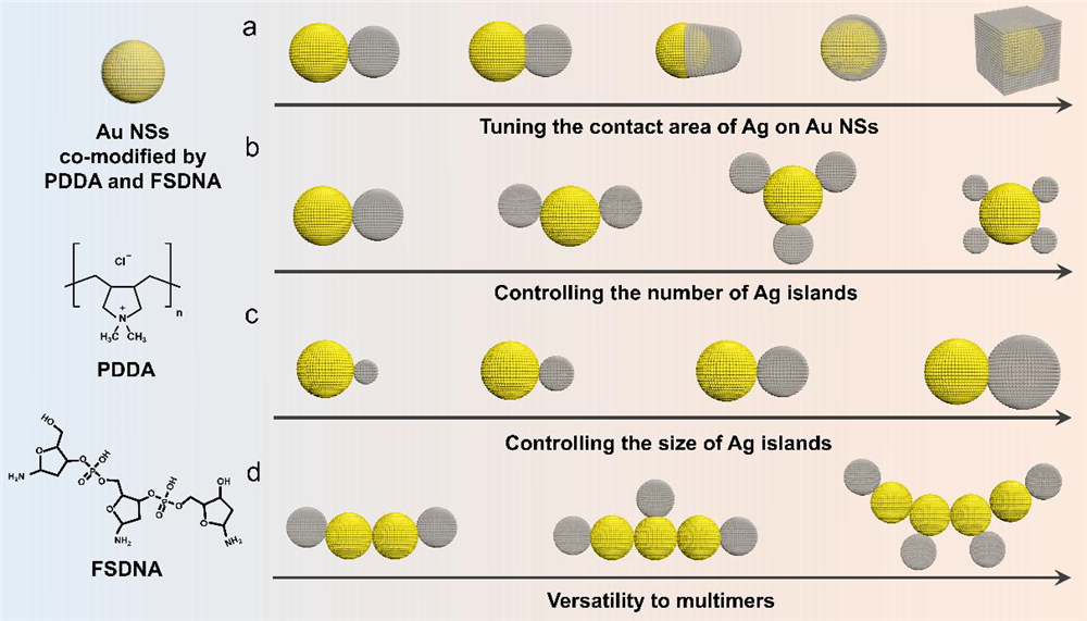 图1. 四种典型精细可调的不对称 Au-Ag纳米结构:(a)接触面积;(b)Ag 岛的数量;(c)Ag 岛的大小;(d)不同Au组装体上银岛的生长(黄色:Au,灰色:Ag)。
