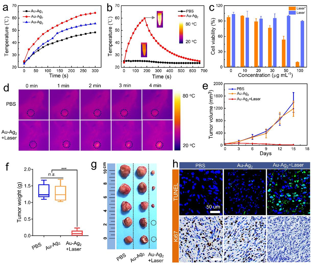 图2. 不对称Au-Ag纳米结构的光热转换性能: (a) Au-Ag1、Au-Ag2 和 Au-Ag3的光热转换效率;(b) 分散在水 (100 ug mL-1) 中的 Au-Ag2悬浮液的加热曲线,用 808 nm 激光照射(1 W cm-2);(c) 通过MTT测定,具有不同浓度的 Au-Ag2在有(橙色)或没有(蓝色)激光照射下4T1细胞的活力;(d) PBS、Au-Ag2组小鼠在激光照射(808 nm,1 W cm-2)下不同时间点的体内近红外热成像;(e)肿瘤随时间生长曲线;(f)-(g) 治疗15天后小鼠的平均肿瘤重量和肿瘤解剖图像;(h) 肿瘤抑制实验。