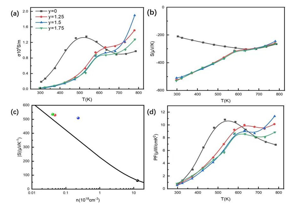 图2. (a) Pb0.97Sb0.03Te + y wt% Cu12Sb4S13样品电导率随温度的变化关系;(b) Pb0.97Sb0.03Te + y wt% Cu12Sb4S13样品Seebeck系数随温度的变化关系;(c) 室温下所有复合材料的塞贝克系数随载流子浓度的变化情况;(d) Pb0.97Sb0.03Te + y wt% Cu12Sb4S13样品功率因子随温度的变化关系。