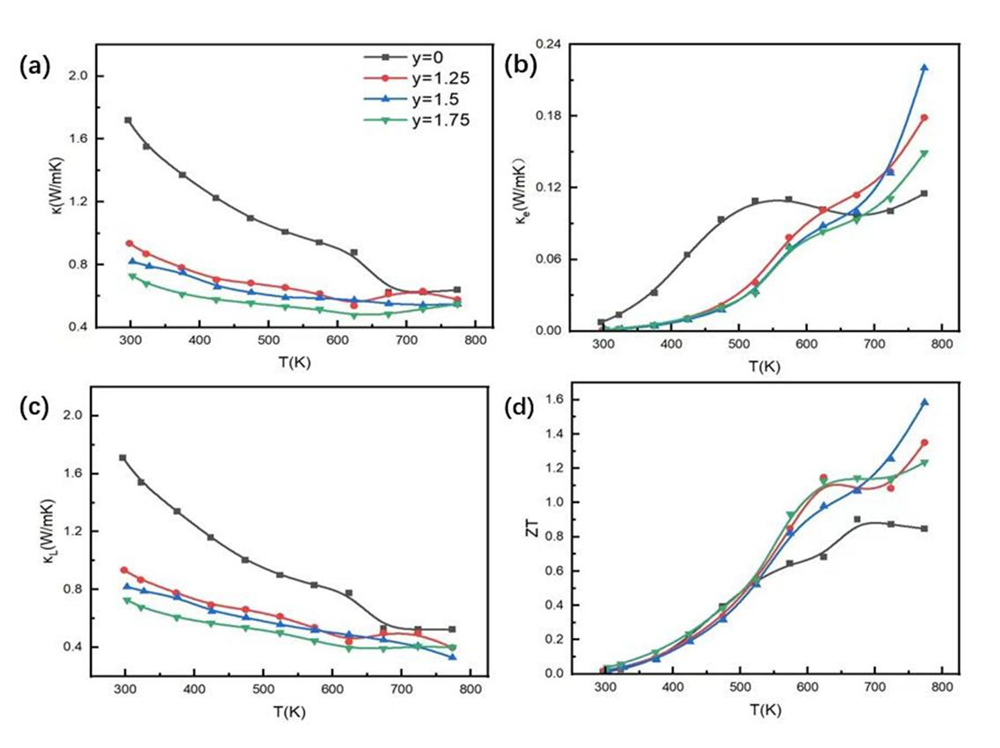 图3. (a) Pb0.97Sb0.03Te + y wt% Cu12Sb4S13样品总热导率随温度的变化关系;(b) Pb0.97Sb0.03Te + y wt% Cu12Sb4S13样品电子热导率随温度的变化关系;(c) Pb0.97Sb0.03Te + y wt% Cu12Sb4S13样品晶格热导率随温度的变化关系;(d) Pb0.97Sb0.03Te + y wt% Cu12Sb4S13样品热电优值随温度的变化关系。
