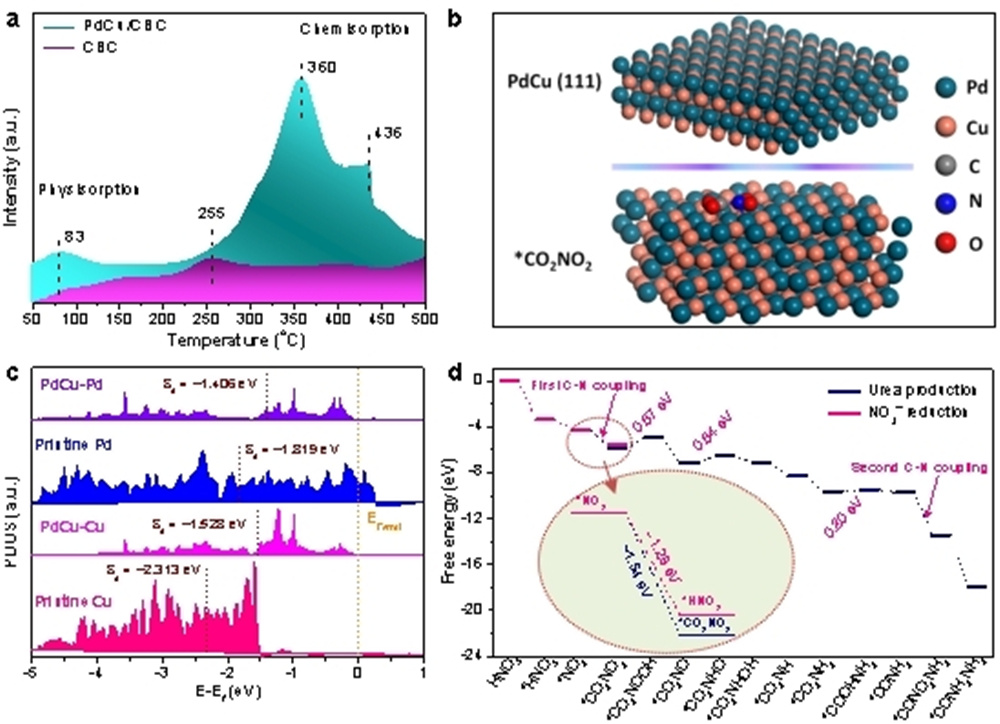 图2. (a) PdCu/CBC 和CBC样品的CO2-TPD图;(b) DFT计算优化的Pd−Cu合金 (111)晶面和中间体*CO2NO2结构图;(c) 双金属Pd−Cu、单金属Pd和单金属Cu的Pd-4d或Cu-3d轨道的态密度图,虚线表示Pd或Cu原子的d带1xbet(中国),费米能级设置为0 eV;(d) DFT计算PdCu/CBC电催化合成尿素途径的吉布斯自由能图。