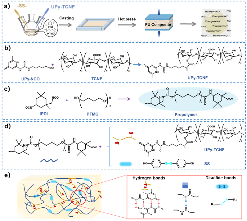 图1 a) 聚氨酯弹性体合成过程图示; b)UPy-TCNF合成; c)预聚物合成; d)PU-SS-UTCNF合成;e) 聚氨酯结构示意图。