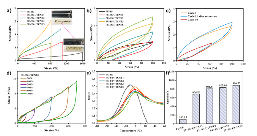 图2 a) PU-SS、PU-SS-UTCNF弹性体应力-应变曲线; b)拉伸滞后曲线; (c)100%应变下PU-SS-TCNF3第1、10个循环和松弛10 min后第11个循环; d) PU-SS-UTCNF3的连续循环拉伸曲线; PU-SS和PU-SS-UTCNF薄膜的(e)损耗因子和(f)交联度。