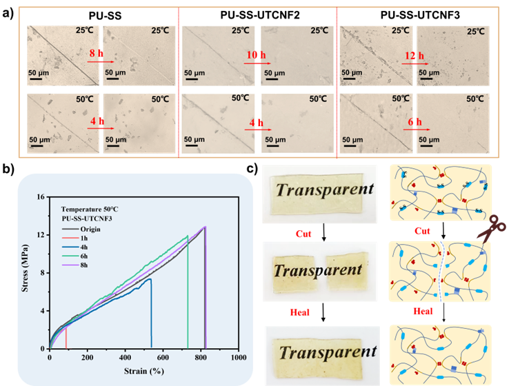 图3 a)PU,PU-SS-UTCNF2,PU-SS-UTCNF3表面划痕自修复测试; b)PU-SS-UTCNF3不同时间的应力-应变曲线;c)剪裁样品自愈合过程中结构演变。