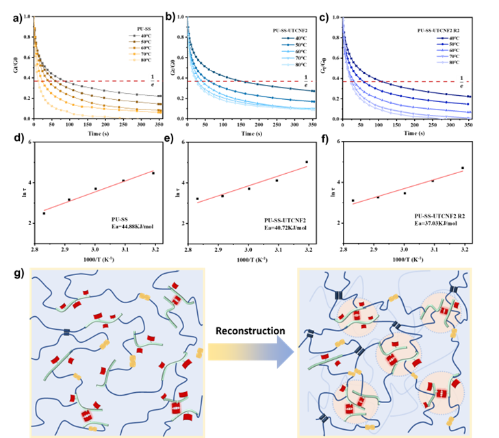 图4:不同温度下a)PU-SS, b)PU-SS-UTCNF2, c)PU-SS-UTCNF2 R2的应力松弛曲线; d) PU-SS, e) PU-SS-UTCNF2, f) PU-SS-UTCNF2R2的松弛时间对数与温度倒数的线性拟合; g) PU-SS-UTCNF的再加工结构重组机制。