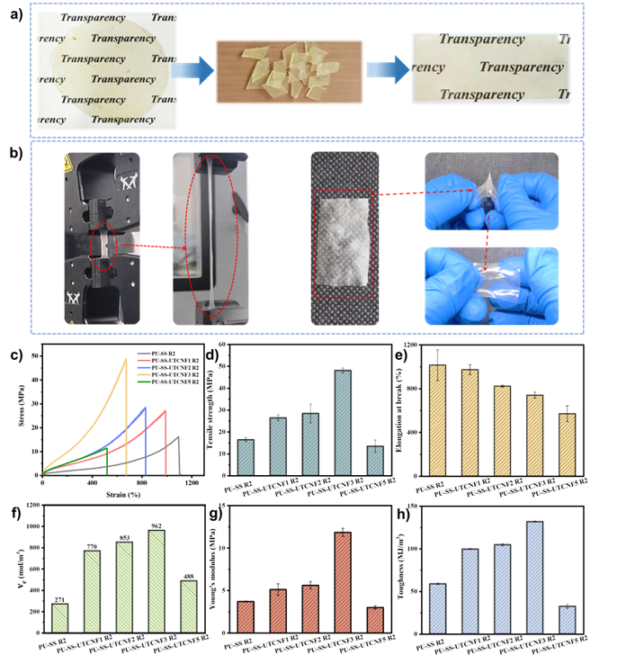 图5 a) 聚氨酯弹性体的再加工示意图; b)聚氨酯弹性体的抗损伤性能;c) PU-SS、PU-SS-TCNF薄膜二次加工后的应力-应变曲线; PU-SS R2 和PU-SS-TCNF R2 弹性体的d)拉伸强度;e)断裂伸长率;f)交联度;g)杨氏模量;h)韧性。