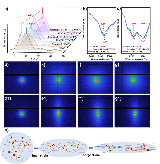 图6 PU-SS、PU-SS-UTCNF3、拉伸状态下PU-SS-UTCNF3、PU-SS-UTCNF3R2的a)XRD曲线, (b)/ (c) FTIR光谱;(d)PU-SS, (e) PU-UTCNF3, (f) PU-SS-UTCNF3, (g) PU-SS-UTCNF3R2 的2D SAXS散射图;500% 应变下(d1) PU-SS, (e1)PU-UTCNF3, (f1)PU-SS-UTCNF3, (g1)PU-SS-UTCNF3 R2的2D SAXS散射图; (h) PU-SS-UTCNF 的增强增韧机制示意图。