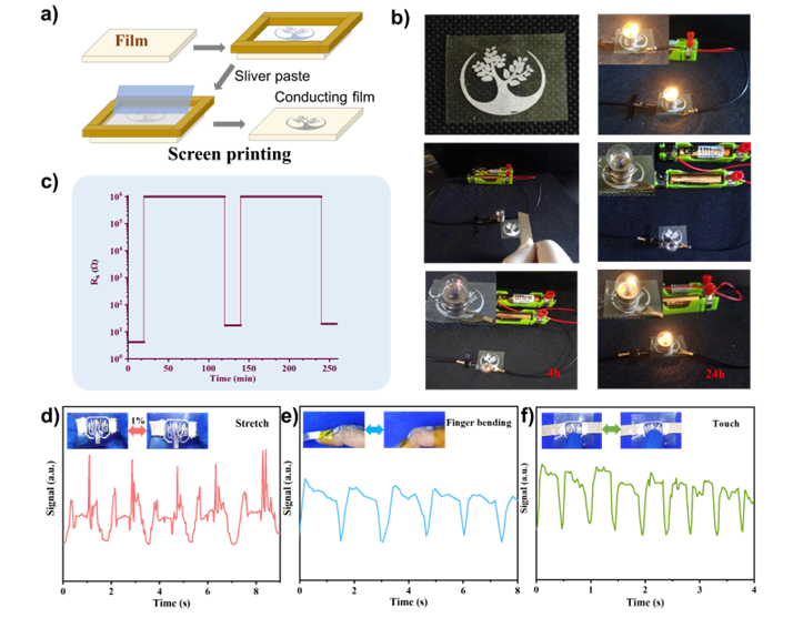 探索了弹性体在可穿戴设备中的应用。当通过丝网印刷导电银浆获得的导电薄膜被切断时,所连接的小灯泡熄灭,并且在50°C下24小时后恢复到相同的亮度。同一位置重复划痕测试,第一、二次划痕的恢复时间均为100分钟,证明了PU-SS-UTCNF在可穿戴传感器自动修复中的应用潜力。测试了再加工后的PU-SS-UTCNF R2薄膜拉伸(图7d)、弯曲(图7e)和触摸(图7f)等不同运动模式下的传感性能,在循环运动过程中,得到的电流响应稳定且可重复。