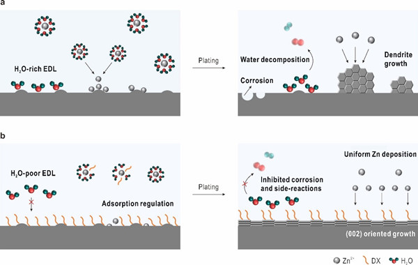 图1. 不同电解液中的锌沉积机理示意图:(a) ZnSO4; (b) DX/ZnSO4。