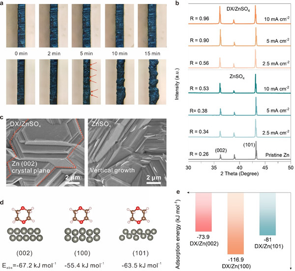 图2. (a) 5 mA cm-2下,ZnSO4和DX/ZnSO4电解质中Zn的原位沉积;(b) 在5 mAh cm−2电镀容量下(R = I(002)/I(101)),不同电流密度下沉积Zn的XRD谱图;(c) 10 mA cm−2下沉积Zn的SEM图像;(d) DX分子在Zn(002),(100),(101)表面的吸附能;(e) 在DX吸附的Zn原子上Zn2+的吸收能。氧原子用红色表示,氢用粉色表示,碳用棕色表示,锌用灰色表示。