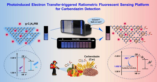 近期,中科院合肥研究院固体所能源材料与器件制造研究部蒋长龙研究员团队在基于光致电子转移的比率荧光传感体系用于快速可视化定量检测环境和食品中多菌灵残留研究方面取得新进展。相关研究成果以“Photoinduced Electron Transfer-triggered g-C3N4\Rhodamine B Sensing System for the Ratiometric Fluorescent Quantitation of Carbendazim”为题,发表在国际分析领域TOP期刊Analytical Chemistry (Anal. Chem., 2023, DOI: 10.1021/acs.analchem.2c05691)上。 多菌灵是一种苯并咪唑类农药,具有广谱杀菌特征,在农业生产中应用广泛。但多菌灵在自然界中降解速度较慢,其残留随呼吸、皮肤吸收或误食进入体后,药物毒素会对肾脏造成破坏,甚至导致肾功能受损、精神恍惚等中毒症状,严重危害消费者安全。发展便捷、快速、高效检测多菌灵残留方法成为控制和处理农残污染的关键环节。目前,国内外用于多菌灵残留检测的主要分析方法仍然局限于实验室仪器及免疫分析法等,这些方法通常存在成本高、操作复杂、耗时长等问题。因此,发展快速、低成本、特异性强、灵敏度高的多菌灵检测新方法具有非常重要的意义。 鉴于此,研究团队基于光致电子转移(PET)机理建立了简单、高效、可靠的比率荧光传感体系,并开发了新型便携式传感平台用于多菌灵的快速可视化定量检测。该传感器由超薄石墨氮化碳纳米片(g-C3N4 nanosheet)和罗丹明B(RB)构成,多菌灵通过静电作用与氮化碳纳米片反应,并由光致电子转移引发氮化碳纳米片的蓝色荧光猝灭,而罗丹明B橙色荧光保持不变。传感器通过由蓝到紫的灵敏荧光色度变化,实现对多菌灵的快速可视化响应及读数检测,检测限(LOD)低至5.89 nM,远低于国家最大残留标准。此外,借助3D打印技术及智能手机颜色识别器,研究团队设计的便携式智能传感平台成功应用于实际样品中多菌灵检测,并表现出良好的抗干扰能力,为农药残留现场高灵敏度快速检测提供了新策略。 上述研究工作得到了国家重点研究与发展计划、国家自然科学基金项目、安徽省重点研究与开发计划的支持。