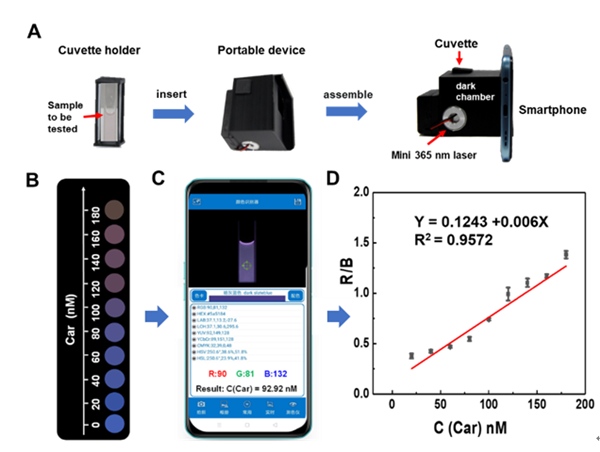 图2. (A)便携式多菌灵检测传感平台设计与基本操作流程;(B)荧光颜色对不同浓度多菌灵的响应;(C)传感平台操作界面;(D)R/B比值与多菌灵浓度的线性关系。