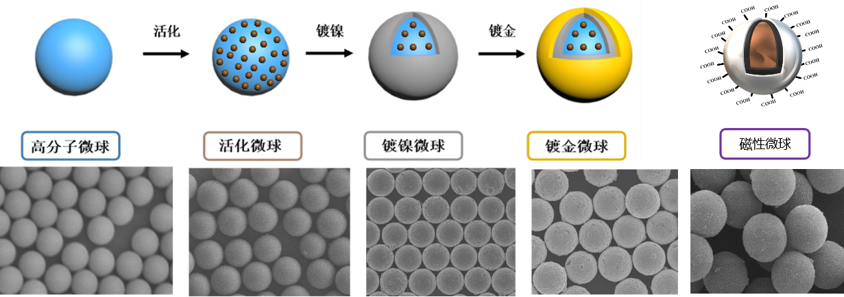 •通过单体复配和交联剂设计,实现力学强度优化和回弹率的提升•基于化学镀工艺,开发专用镀液,实现单分散镀镍/金/磁微球规模化制备