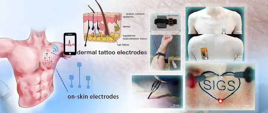皮肤集成电子因其在个性化健康管理、通讯和人机交互等多领域的应用潜力而受到广泛关注。其中,“纹身电子”(表皮电子)泛指一种可直接贴在皮肤上的柔性贴片,具有临时纹身的轻松、舒适等特点。纹身,将墨水或染料颜料注入皮肤真皮层,是一种已普遍存在的身体修饰技术。迄今已报道的“纹身电子”大多以皮肤表面集成的形式呈现,而使用真皮纹身实现电生理信号的精确诊断是一种尚未探索的皮肤集成电子范式。