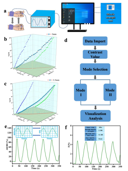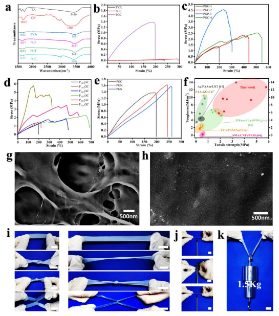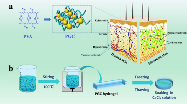 近期,东北大学医学与生物信息工程学院田野副教授团队开发了一种皮肤启发的超强韧和可回收的超分子水凝胶电子皮肤PVA-Gp/TA-CaCl2 (命名为:PGC),使用一次性物理交联盐析-冻融方法,没有有毒副产物和复杂的工艺。此工作将盐析法引入超分子自组装体系中,调节大分子链在分子上的聚集缠结,从而获得力学性能可调的水凝胶网络。盐析剂--β-甘油磷酸钠(Gp),比常用的盐析剂(如NaCl)更有效。并通过添加单宁酸(TA)来赋予水凝胶抑菌和防紫外线等性能。最后,采用一次冻融的方法进一步提高链间结晶度,从而提高其机械强度。此外,添加Gp后的水凝胶的机械强度是相同质量甘油水凝胶的37倍,拉伸应力可达3.35 MPa,Gp和PVA浓度对PGC水凝胶的机械强度均有调节作用,最终能达到5.79 MPa的抗拉强度。PGC水凝胶具有超强韧性、导电性、抗菌性、防紫外性、抗溶胀性、可回收性和透光性。PGC水凝胶电子皮肤可以将皮肤的保护特性和灵活的传感结合起来,适用于生活中的多种复杂场景。PGC水凝胶电子皮肤作为新一代电子皮肤接口,可用于精确监测日常生理活动(心电图、微表情、关节活动、咳嗽),实现人机交互。PGC水凝胶电子皮肤还用于水下人机交互,通过水下活动和莫尔斯电码传输信息,并使用解密程序对水下/陆上信息进行加密/解密。此外,利用windows系统分析软件,设计PGC水凝胶电子皮肤作为关节损伤患者肌力训练的关节康复系统,动态模拟肌力变化,反馈健康状态,实现人机交互(前端数据采集—后端分析处理)。这种多功能仿生电子皮肤将对柔性传感、康复医学、人机交互、机器人、VR/AR和元宇宙的未来产生重大影响。