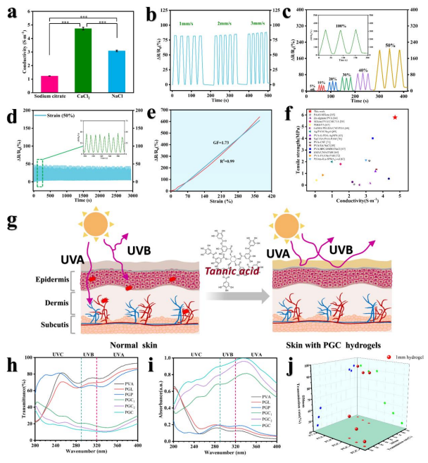 图3. PGC水凝胶的导电以及紫外过滤性能