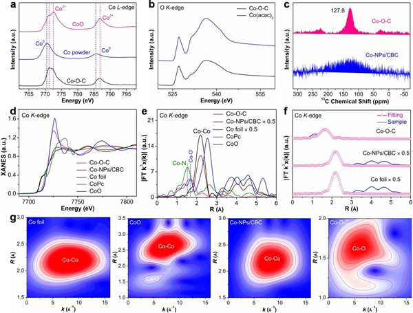 图1. (a)Co-O-C和标准样品的Co L边XANES光谱; (b) Co-O-C和Co(acac)2的OK边XANES光谱; (c)Co-NPs/CBC和Co-O-C的13C 固体核磁对照图;Co-NPs/CBC、Co-O-C和标准样品的Co K边(d) XANES光谱和 (e) R空间EXAFS光谱; (f) Co-NPs/CBC、Co-O-C和标准样品的Co K边的EXAFS光谱R空间拟合结果; (g) Co-NPs/CBC、Co-O-C和标准样品的CoK边小波变换图。