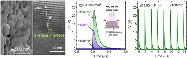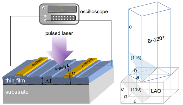 研究人员发现层状Bi2Sr2CuOy(Bi-2201)薄膜可通过扭转45度角的方式沿钙钛矿型单晶基板外延生长。层状Bi-2201薄膜不仅表现出较高的超导转变温度(~15K),且其面内和面外热电势具有高度各向异性。在斜切0、5和10度的铝酸镧单晶基板上可诱导生长倾角为0、5和10度的Bi-2201薄膜。基于上述生长的薄膜可构筑出脉冲激光能量探测原型器件(图1)。当脉冲激光辐照薄膜时,将在薄膜面间形成温度梯度ΔT,进而在面内形成电势差产生脉冲电压信号。