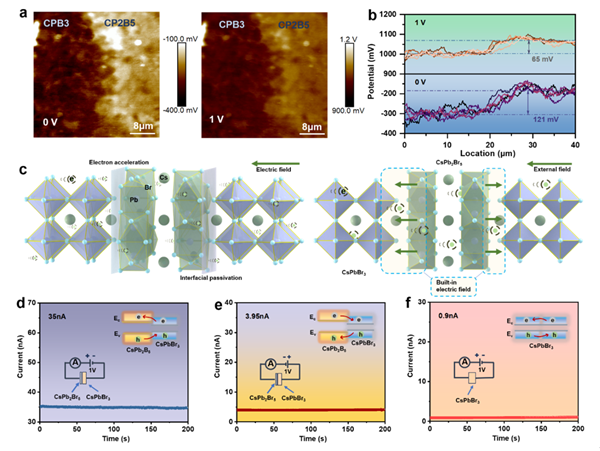 图. CsPb2Br5增强CsPbBr3中电荷载流子传输:(a)开尔文探针绘制的CsPbBr3和CsPb2Br5界面之间的接触电位差。左图显示无外部偏压时的接触电势图,右图显示对CsPbBr3侧施加1 V偏压时的接触电势图;(b)0 V和1 V时CsPbBr3和CsPb2Br5之间的电势变化;(c)当CsPbBr3体相中的电子通过CsPb2Br5时发生电子加速,以及界面修复示意图;(d)在1 V偏压下将正电压施加到CsPb2Br5一侧的金电极上,晶圆器件的暗电流;(e)当将正电压施加到未被CsPb2Br5处理的晶圆的金电极侧时,晶圆器件在1 V偏压下的暗电流;(f)在1 V偏压下纯CsPbBr3晶圆器件的暗电流。