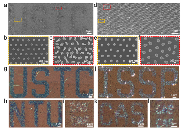 图2. 图案化Au-Ag二聚体阵列的表征:(a) 3D Au-2D Ag二聚体阵列的低倍率SEM图像(字母:USTC,线宽:4 μm);(b-c) 图(a)中彩色方格所对应的高倍率SEM图像;(d) 3D Au-3D Ag二聚体阵列的低倍率SEM图像(字母:ISSP,线宽:2 μm);(e-f) 图(d)中彩色方格所对应的高倍率SEM图像;(g-i) 线宽分别为4 μm(USTC)、2 μm(NTU)和400 nm(CAS)的图案化3D Au-2D Ag二聚体阵列的暗场光学图像;(j-1) 线宽分别为4 μm(ISSP)、2 μm(CAS)和400 nm(CAS)的图案化3D Au-3D Ag二聚体阵列的暗场光学图像。