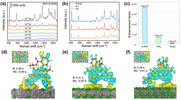 图2. (a) 不同浓度的R6G分子吸附在β-MoB上的增强拉曼光谱;(b) β-MoB、Au和Ag颗粒SERS衬底对所吸附10-4 M R6G分子的增强拉曼光谱;(c) 三种硼化钼对R6G探针分子的增强因子;(d-f) 吸附在β-MoB、MoB2和Mo2B5衬底表面R6G分子的差分电荷密度和Bader电荷分布。