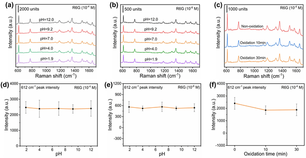 图3. (a,b) 吸附了R6G分子的硼化钼粉体在不同pH溶液中浸泡3 h后的拉曼光谱;(c) 在1000 °C下氧化不同时间的硼化钼粉体上吸附的R6G的拉曼光谱;(d,e) 硼化钼经不同pH溶液浸泡后吸附的R6G分子拉曼特征峰在612 cm-1处的强度;(f) 1000 °C下氧化不同时间后R6G分子拉曼特征峰在612 cm-1处的强度。