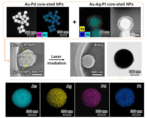 该策略的核心关键是利用激光诱导的快速逐层熔化-融合过程,有效地避免了金属的各向异性生长。理论模拟发现,这种逐层熔化-融合主要归于激光的趋肤深度有限,使金颗粒产生的光热效应局域在超粒子的表面。此外,该方法具有高度普适性,适用于各种强光热效应的纳米颗粒作为组装基元,不论其尺寸、形貌与成分。例如,研究人员以Au-Pd和Au-Ag-Pt核壳纳米颗粒作为组装基元,制备出了尺寸均一、表面光滑的Au-Ag-Pd-Pt合金微球(图2),有望应用于粒径均一的高熵合金微球的高效制备。