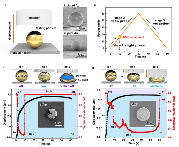 图3. 深度压合下的电导率测试。(a)纳米压痕系统的示意图,插图显示了商业购买的镀金微球(ⅰ)和基于激光辐照策略制备的纯金微球(ⅱ)的典型SEM图;(b)力-时间曲线表示压头受压时加载的位移程序;(c、d)深度压缩下镀金微球(c)和纯金微球(d)的原理示意图和电导率响应。(c)和(d)插图:深度压合后典型镀金微球和纯金微球对应的SEM图。背景阴影用于表示导通(蓝色)或断开(紫色)状态。