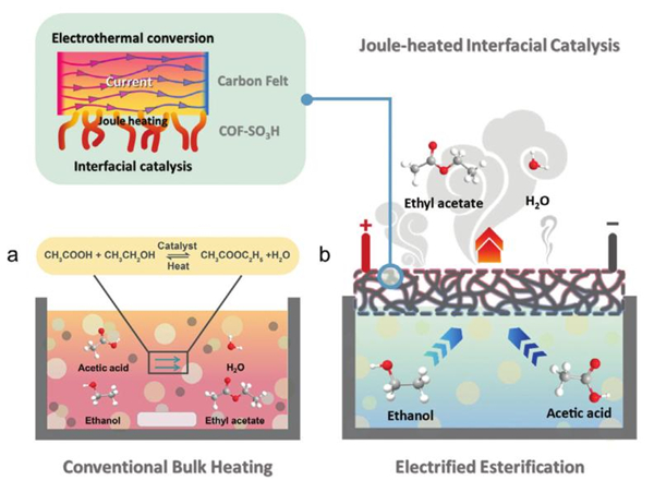 图1. (a) 传统体相加热(CBH)系统;(b) 用于酯化反应的焦耳加热界面催化(JIC)系统。