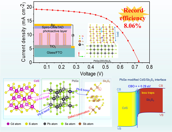 近日,中国科学院合肥物质院固体所能源材料与器件制造研究部王命泰和陈冲研究员团队在三硫化锑(Sb2S3)太阳电池研究方面取得重要进展,提出了三维分布界面硒化铅(PbSe)诱导Sb2S3结晶及界面能带优化的策略,实现了Sb2S3太阳电池高效的光电转换效率(8.06%)。相关研究成果发表在Advanced Functional Materials上。