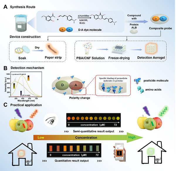 随着公众对食品安全和环境健康关注度的持续升高,如何实现高效、快速、精准地检测农药残留已成为当下的研究热点。近期,中国科学院合肥物质科学研究院固体物理研究所能源材料与器件制造研究部蒋长龙研究员团队在实时可视化菊酯类农药检测上取得了重大突破,研发了超分子荧光探针,实现了液相和气相菊酯类农药的实时同步可视化检测。相关研究成果以“Supramolecular Fluorescence Probe for Rapid Visual Detection of Pyrethroid and Composite Aerogel as Pyrethroid vapor Sensor”为题发表在发表在国际分析领域TOP期刊 Analytical Chemistry (Anal. Chem. 2025, DOI: 10.1021/acs.analchem.5c02399) 上。