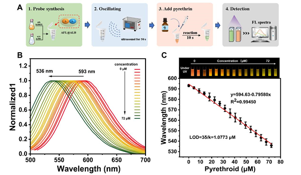 菊酯类农药常用于蔬果、茶叶等农产品的杀虫防控。虽然其具有高效低毒的优点,但过量或长期接触仍可能对人体造成严重伤害,引发如头痛、恶心、肌肉无力等健康问题。传统的农残检测方法,如高效液相色谱,虽然精准,但操作复杂、仪器昂贵,不适用于农业现场或家庭快速检测。为解决这一难题,研究团队设计了一种由黄酮类荧光染料(AFL)与白蛋白(ALB)复合而成的超分子荧光探针 AFL@ALB。该探针会与菊酯类农药分子发生分子间相互作用,导致超分子荧光探针周围微环境极性改变,使得荧光颜色由黄色变为绿色,且整个变化过程仅需10秒,肉眼即可观察。研究表明,该探针在0–72 μM浓度范围内具有出色的线性响应,检测限可达1.0773 μM,远低于欧盟对茶叶等农产品农药残留限值。