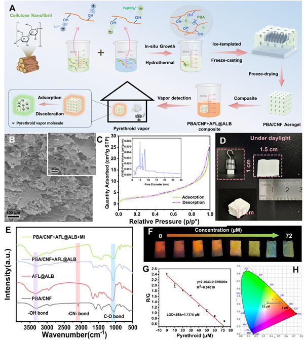 此外,菊酯类农药不仅存在于液态残留中,还会挥发为气体,潜藏在环境中危害人体健康,如蚊香释放的气相菊酯。然而,目前针对农药气态残留的检测手段非常有限。为此,研究人员创新性地将AFL@ALB探针与高吸附性能的普鲁士蓝/纳米纤维素气凝胶(PBA/CNF)结合,研制出可实时可视化监测气相菊酯类农药的新型荧光气凝胶传感器PBA/CNF+AFL@ALB。通过模拟蚊香中菊酯的释放,实验验证了该传感器可实现气相菊酯农药的高效捕集与可视化识别,检测限低至1.7378 μM。