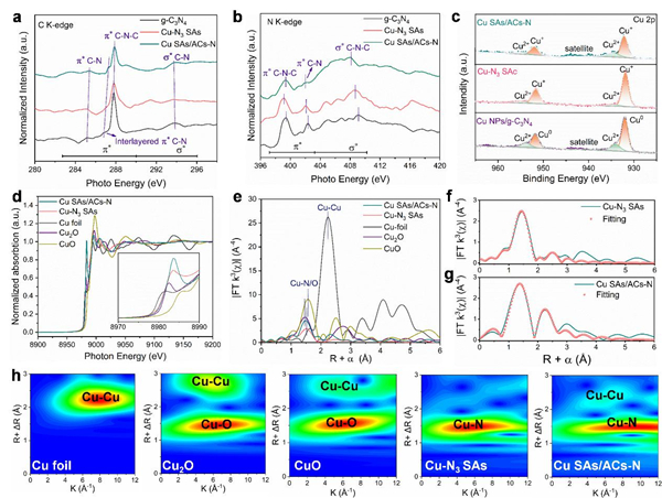 图1. Cu-N3 SAs及其对比样的C K边XANES光谱(a)、N K边XANES光谱(b)、Cu 2p的高分辨XPS光谱(c)、Cu K边XANES光谱(d)、Cu-K 边的 k3 加权 FT-EXAFS 光谱(e);(f)Cu-N3 SAs的Cu K边R空间EXAFS光谱;(g)Cu SAs/ACs-N 的Cu K边R空间EXAFS光谱;(h)Cu-N3 SAs及其对比样的Cu K边小波变换图。
