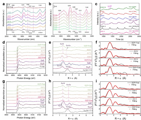图2.(a)在不同电位下,Cu-N3 SAs的原位ATR-SEIRAS光谱;(b)在− 0.9 V(vs. RHE)下,Cu-N3 SAs在60 min内的原位ATR-SEIRAS光谱;(c)在− 0.9 V(vs. RHE)下,Cu-N3 SAs的原位DEMS谱图;Cu-N3 SAs在不同电位下的Cu K边的XANES光谱(d)、k3加权的FT-EXAFS光谱(e)和Cu K边EXAFS光谱(f);Cu SAs/ACs-N在不同电位下的Cu K边的XANES光谱(g)、k3加权的FT-EXAFS光谱(h)和Cu K边EXAFS光谱(i)。